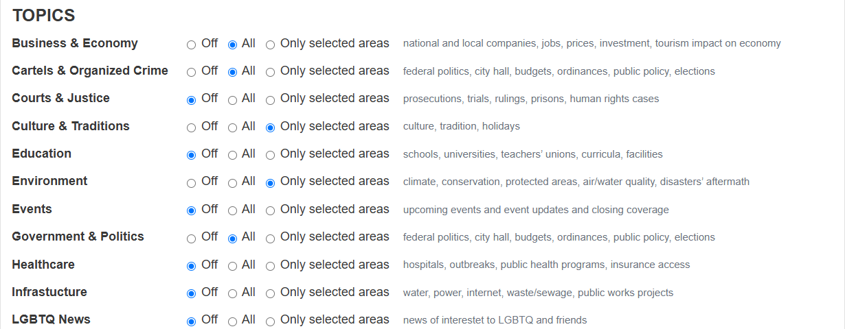 The user wants to follow nationwide news for Business, Cartels, and Government. (They have selected ‘All’)