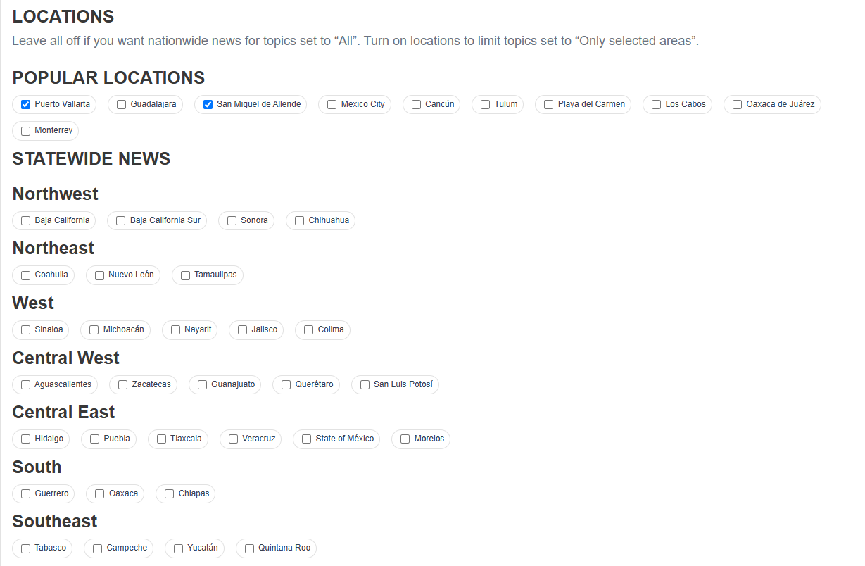 The user wants to follow Culture and Environment news only from the locations they have chosen. The user has indicated that their locations of interest are Puerto Vallarta and San Miguel.